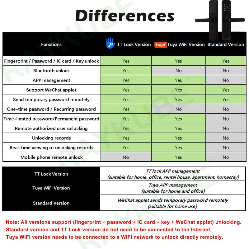The Raykube K8 Tuya Wifi Smart Door Lock offers peace of mind with seven ways to unlock: WiFi, password, app, Bluetooth, mechanical key, card, and fingerprint. It is suitable for a variety of door types—wooden, stainless steel, brass, and steel—and offers reversible handle direction and biometric and key & keypad doorknob functionality. With its support gateway and Tuya smart home platform, you can easily integrate the K8 in your home's existing system.