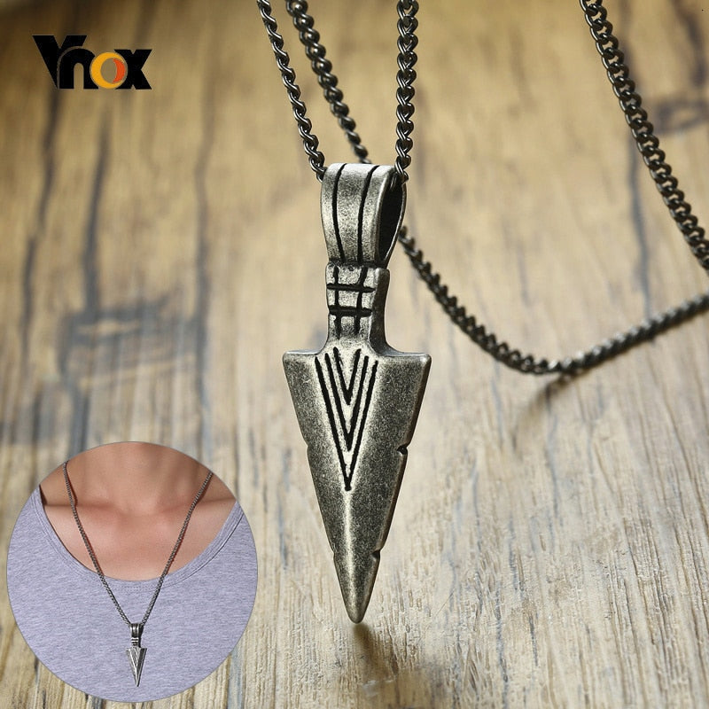 Showcase your bold style with the Retro Viking Spear Pendant Necklace. Crafted from high-quality stainless steel, this tribal-style necklace features an arrowhead pendant with a classic geometric pattern. Perfect for daily and evening wear, it comes in grey, silver, gold, or black to suit any look. With a 60-cm link chain and 30-day money-back guarantee, this cool and punk necklace is the perfect accessory choice.
